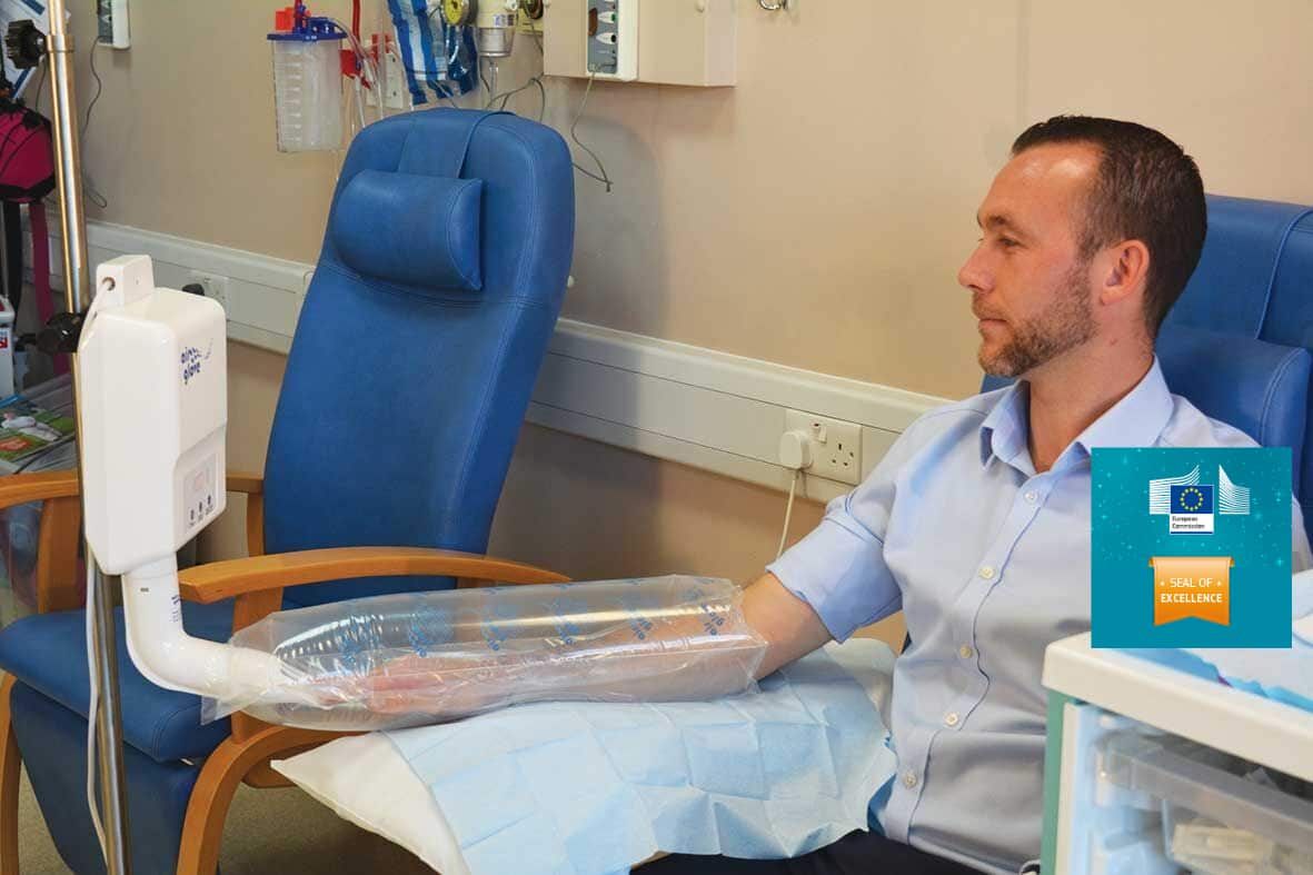 The Airglove is an air warming system to improve access to veins prior to administration of drugs such as chemotherapy. It consists of a heating unit and tube containing a heat outlet, and single-use disposable double-walled polythene ‘gloves’. The glove is placed on the tube and over the forearm; the glove seals on the forearm and heats it using warm air. Heating the limb prior to attempting cannulation dilates the veins and makes cannulation easier and more comfortable for the patient and results in a high percentage achieving a positive outcome on the first attempt.